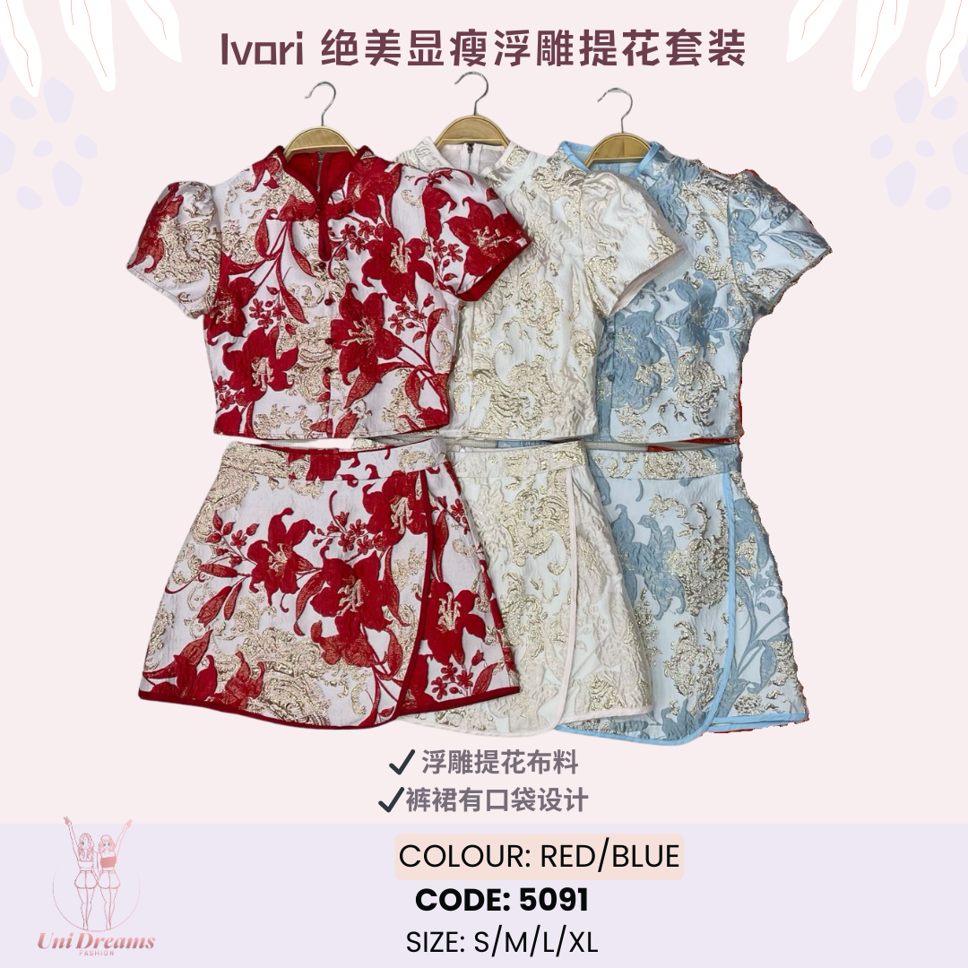 5091 (Ivori Brand) Luxury Embossed Floral Cheongsam Two-Piece Set