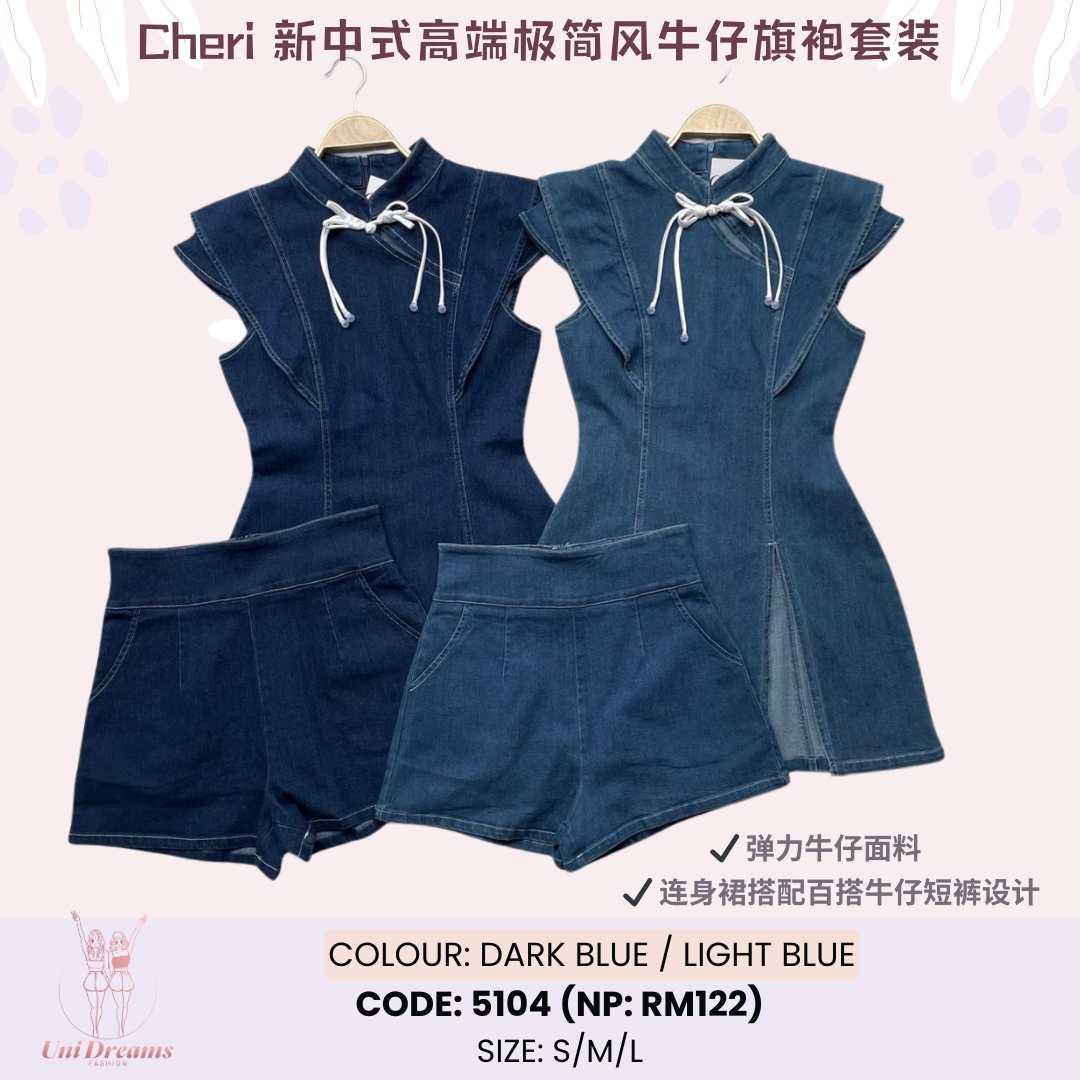 5104 (Cheri Brand) Modern Chinese Elegant Denim Cheongsam Two-Piece Set